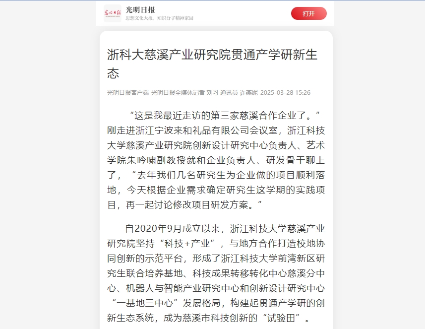 此外,浙科大组建科技特派团并建立了13个不同专业的专家库,吸纳58名专家教授,同时探索学校优秀教授到企业担任科技副总的柔性人才输送模式;探索“产业命题+毕业论文”双导向培养机制,已促成6名硕士研究生在产研平台完成学位论文开题;立足慈溪“小家电产业集群”特色优势,整合省级大学生工业设计创新服务平台资源,通过“产业命题+赛事培育”模式开辟工业设计创新赛道,2024年成功承办第十六届浙江省大学生工业设计竞赛慈溪专项赛,吸引浙江省13所高校200多名大学生参与。