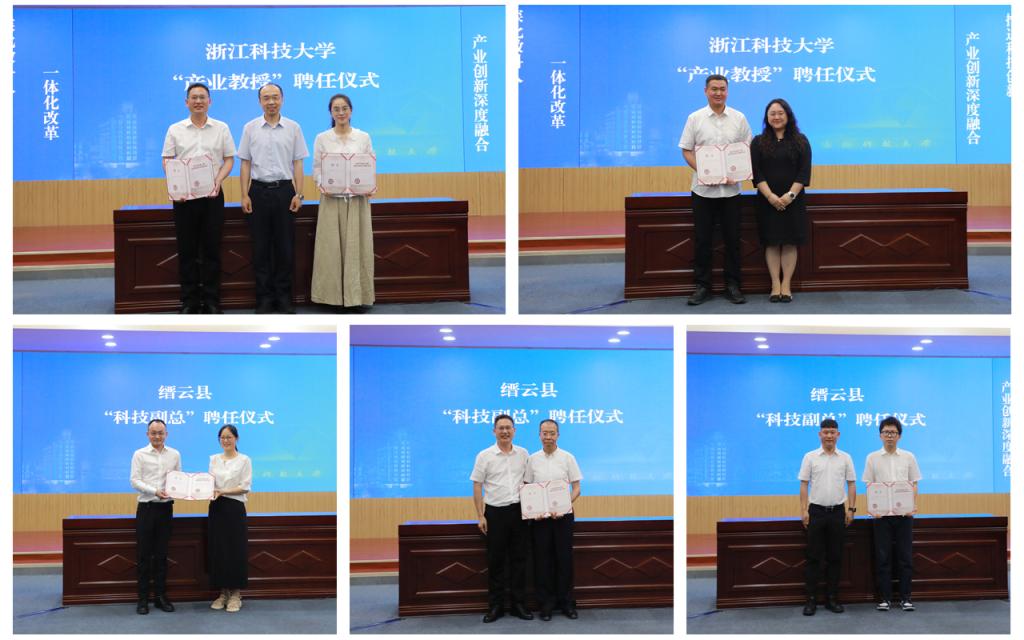 浙江金马逊智能制造股份有限公司总经理林姚辰、浙江君鸿机械有限公司总经理贺小丰和浙江畅尔智能装备股份有限公司电气技术中心主任、校友吕磊受聘为我校“产业教授”。我校智能制造与能源工程学院曹丽丽、杨礼康、王得宝3位老师分别受聘为缙云当地企业“科技副总”。