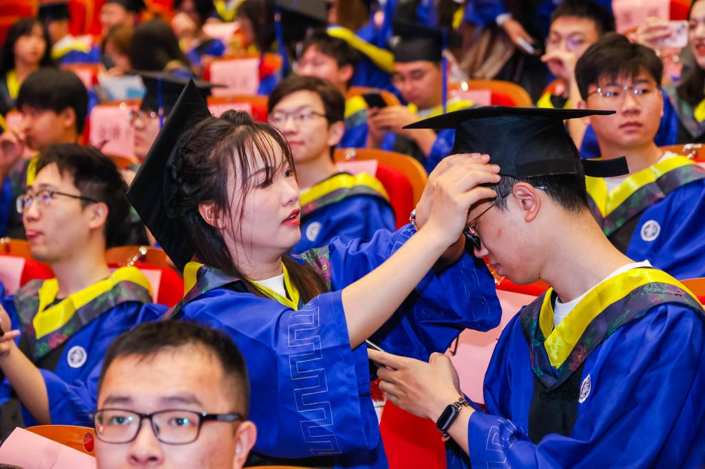 学位授予环节,校学位评定委员会委员一道为硕士学位获得者颁发学位证书、拨穗正冠。毕业生们与校长陈建孟合影留念。